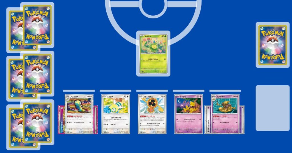 終盤に向けて手札干渉に強い盤面形成をしていく必要があります。【ノココッチ】を盤面に用意して、すぐに手札を復旧しやすくしておいたり、あえて【ユンゲラー】のまま置いておくことで、手札干渉後に進化で手札を増えやすいようにしておいたりと盤面形成が大切です。