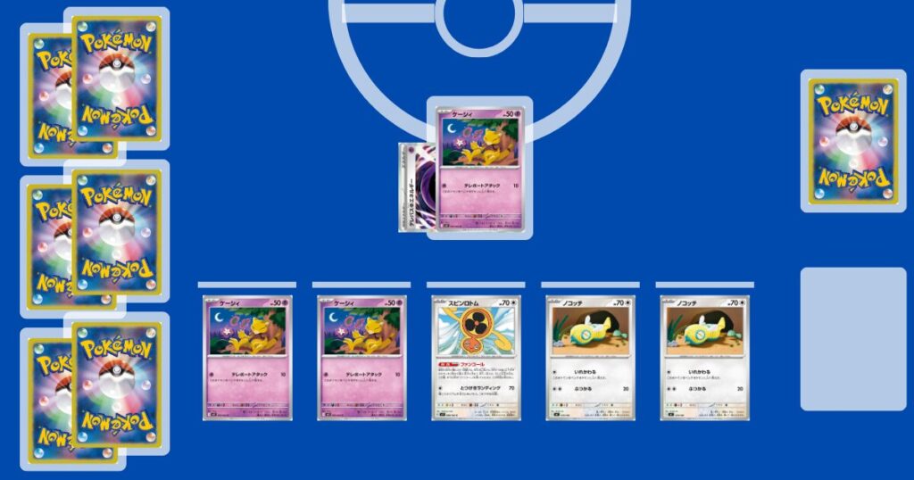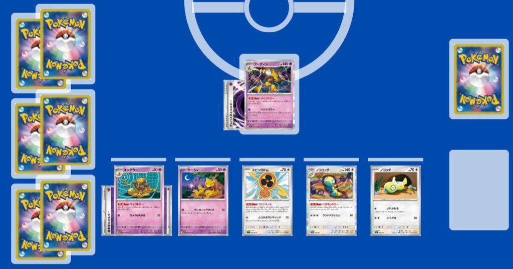 手札干渉に備えて盤面形成をしていく必要があります。【ノココッチ】を盤面に用意して、すぐに手札を復旧しやすくしておいたり、あえて【ユンゲラー】のまま置いておくことで、手札干渉後に進化で手札を増えやすいようにしておいたりと盤面形成が大切です。