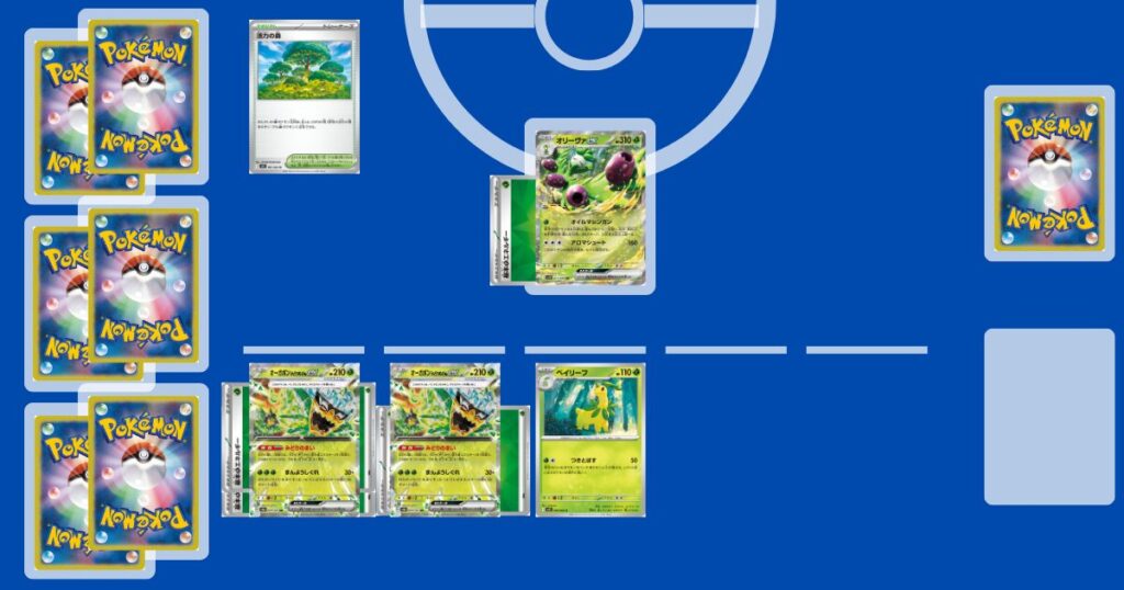 特性「みどりのまい」で【オーガポンみどりのめんex】にエネルギーを貯めておきましょう。【オリーヴァex】が倒されたあとのアタッカーになります。