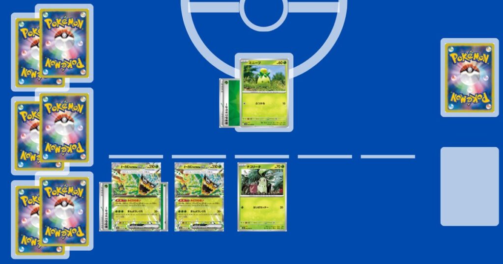 進化ポケモンが手札で渋滞し、たねポケモンの展開が十分にできていない状況では、盤面形成が滞りやすくなります。序盤の安定性にはやや不安が残ります。