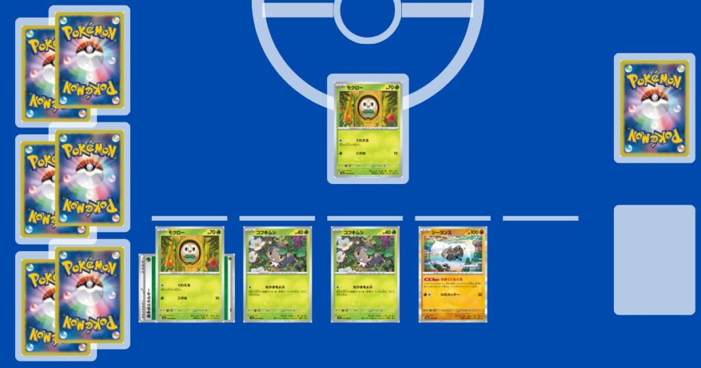 後攻1ターン目は盤面展開をしていきます。サポートは【リーリエの決心】または【ヒカリ】を使って、たねポケモンを並べていきたいです。