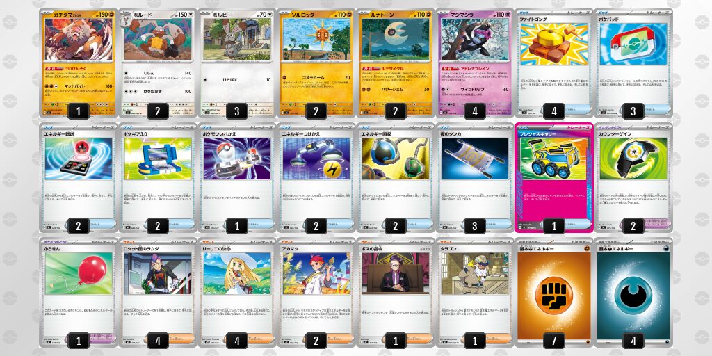 アタッカーの2体目、【ソルロック】、【ルナトーン】、【マシマシラ】などベンチに並べたいポケモンが多いです。特に相手によっては【マシマシラ】を多く並べたいこともあり、考えなしにベンチを埋めてしまうと後から困ります。