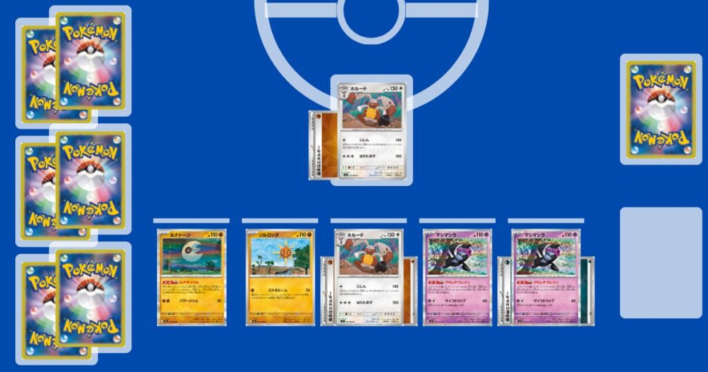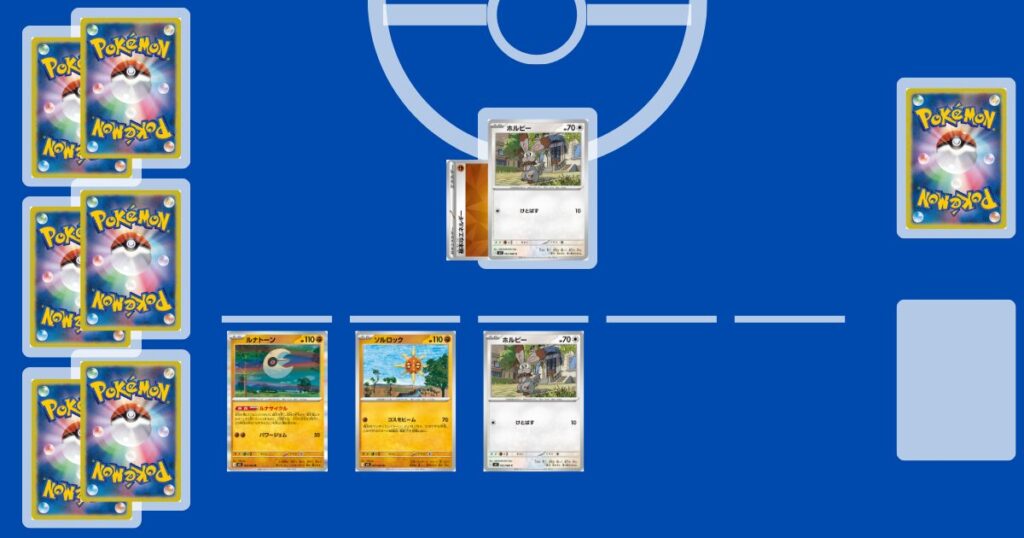 ポケモンの展開は、【ルナトーン】、【ソルロック】を優先します。理想は盤面にこの2体を揃えて、特性「ルナサイクル」で3枚ドローできることです。