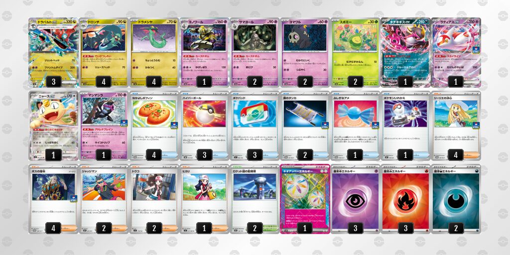 メインアタッカーの【ドラパルトex】ラインがHレギュのため、まだまだ健在のデッキです。特性「フライングエントリー」の【ルチャブル】、【カウンターキャッチャー】、【ナンジャモ】、【ルミナスエネルギー】などがレギュ落ちします。