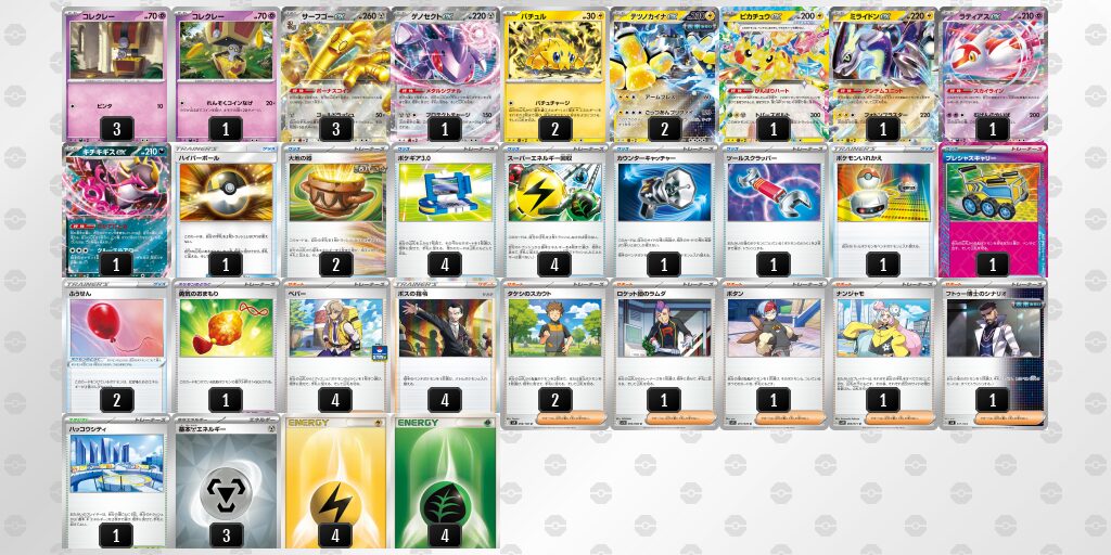 サンプルレシピの特徴的な採用として、「ビンタ」の【コレクレー】が多めに採用されています。1エネで10ダメージ与えられるため、【ピカチュウex】対策として有効です。