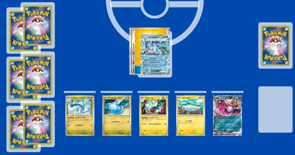 【メガカイリューex】の進化ライン、【シビビール】2体、ドローサポートポケモンでベンチが埋まります。盤面が埋まってしまうため、サブアタッカーの枠や、ドローサポートポケモンを複数並べることが難しいです。