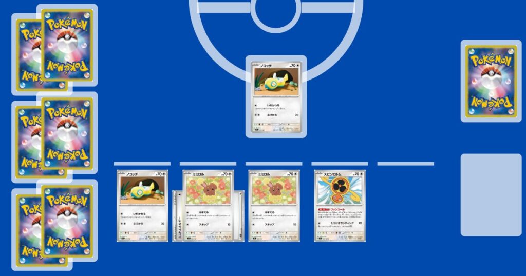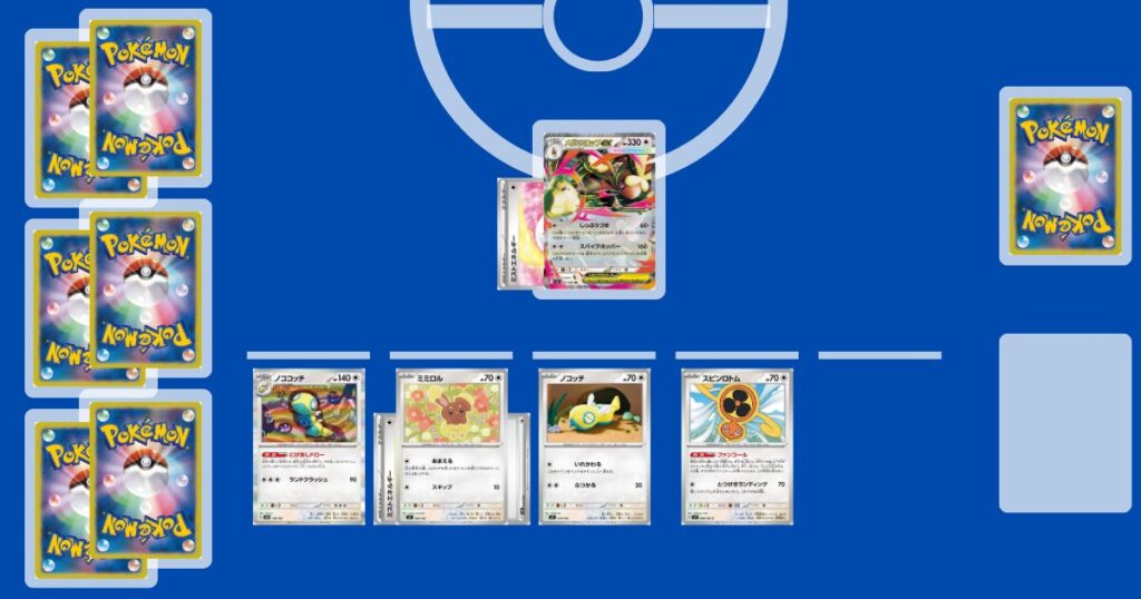 【ふうせん】や【ノココッチ】が手札になく、次の番に【メガミミロップex】をバトル場に出すのに困る場合、しっかりと手貼りをしておきましょう。逃げエネを切って入れ替えることになります。