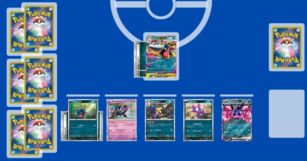 エネルギー加速役として【ストリンダー】、ダメカン調整役として【マシマシラ】がベンチに並びます。ベンチ枠が狭く、ドローサポートポケモンを置けるベンチスペースが限られます。