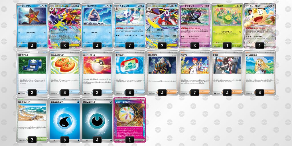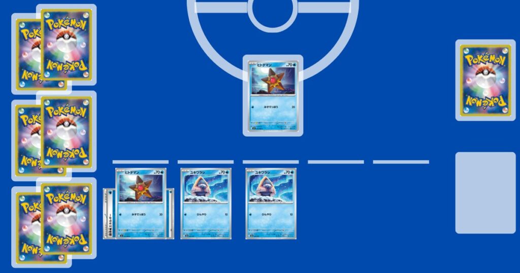 先攻2ターン目に【メガスターミーex】で攻撃を開始したいため、【ヒトデマン】の展開を優先します。次に【ユキワラシ】、【マシマシラ】の順で展開していきたいです。