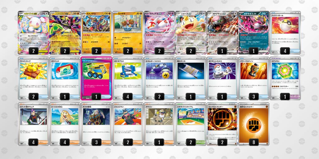 特に「まんようしぐれ」は、お互いのポケモンについているエネルギーの数×30ダメージと火力が大きく伸びるワザのため、エネルギーを多く抱えた【メガジガルデex】は簡単にきぜつさせられてしまいます。