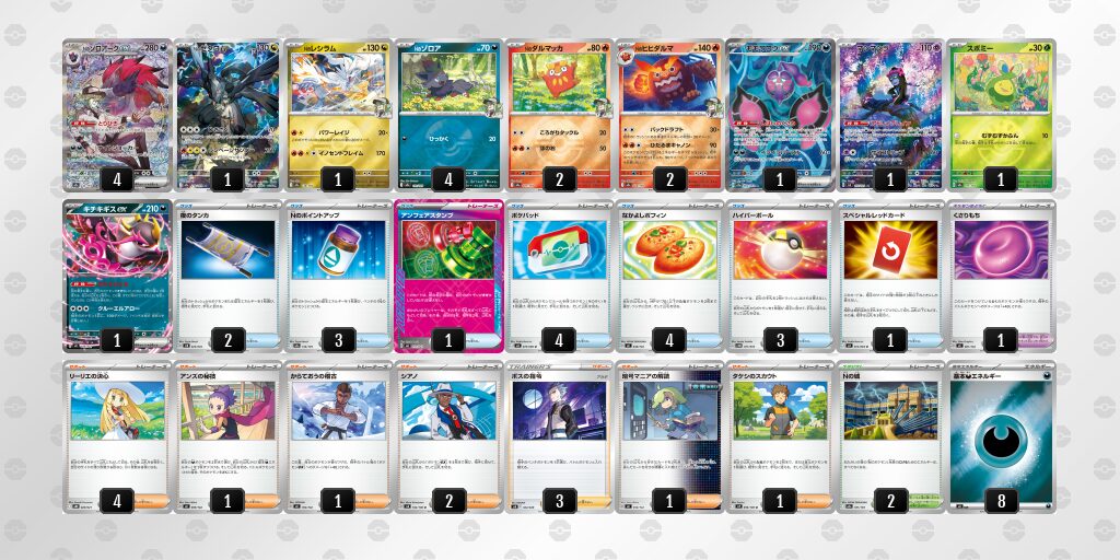 メインアタッカーの【Nのゾロアークex】が特性もちです。【ユキメノコ】を処理できないのであれば、早期に複数体進化は避けましょう。特性「いてつくとばり」でダメカンが蓄積していきます。