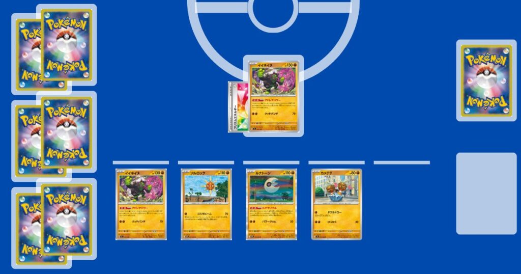ポケモンの展開は、【ルナトーン】、【ソルロック】を優先します。理想は盤面にこの2体を揃えて、特性「ルナサイクル」で3枚ドローできることです。